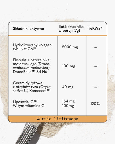 wersja bezsmakowa – Hydrolizowany kolagen rybi NatiCol®, ekstrakt z ziela pszczelnika mołdawskiego (Dracocephalum moldavica) DracoBelle™ Sd Nu DER 1:14-18, ekstrakt z winogron (Vitis vinifera) i jabłek (Malus pumila) ViNitrox™, witamina C liposomalna (Liposovit-C™), aromat, substancja słodząca: sukraloza.